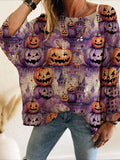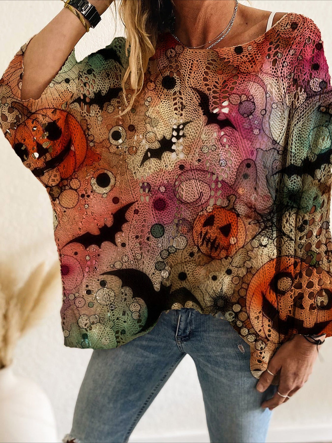 Halloween Theme Off-Shoulder V-Neck Bat & Pumpkin Print Long Sleeve Top