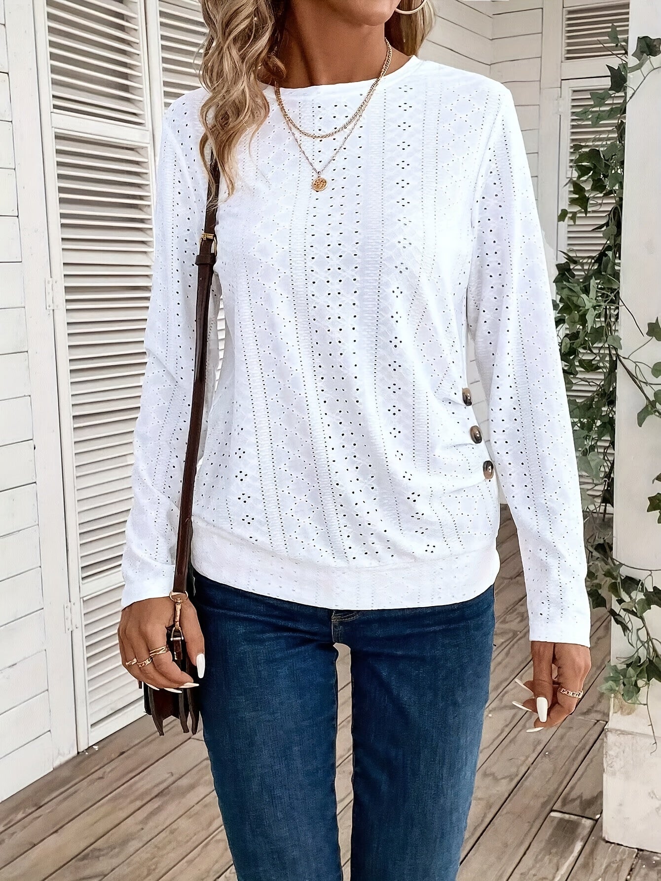 Sale Hollow Button Decor Crew Neck T-Shirt, Elegant Long Sleeve T-Shirt