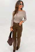 Sale Rose Checkered Pattern Mesh Mock Neck Long Sleeve Top