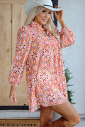 Sale Khaki Abstract Printed Long Sleeve Tied Neckline Mini Dress