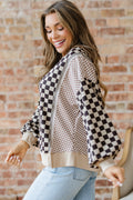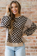 Khaki Mixed Checkered Pattern Patchwork High Low Casual Top