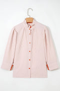 - Striped print button down shirt gives a classic, modern look.Color block patchwork adds trendy contrast with eye-catching detail.Frilled collar brings a feminine touch to classic styling.Lightweight long sleeve shirt offers comfortable everyday wear.