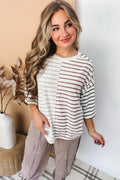 Khaki Stripe Colorblock 3/4 Sleeve Loose T Shirt