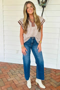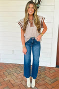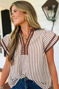 Khaki Stripe Double Ruffled Short Sleeve V Neck Blouse