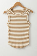 Sale Khaki Stripe Exposed Seam Trim Round Neck Sleeveless Top
