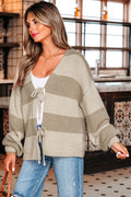 Khaki Striped Color Block Brushed Knit Bow Tie Front Sweater Cardigan