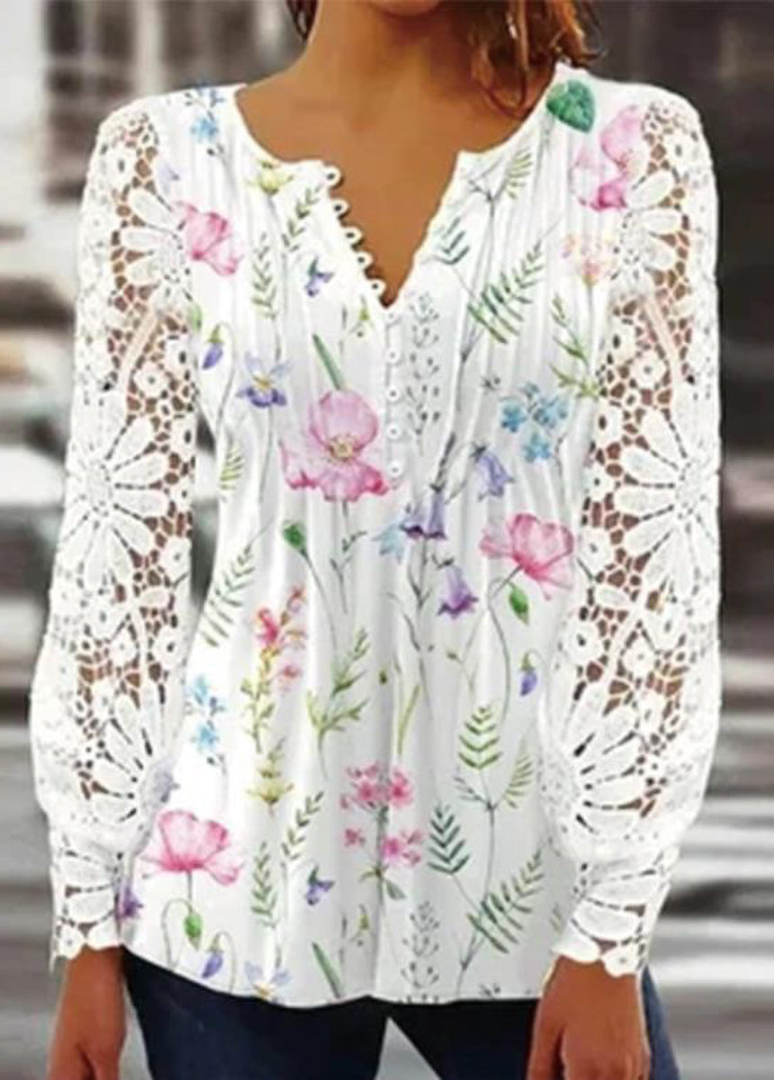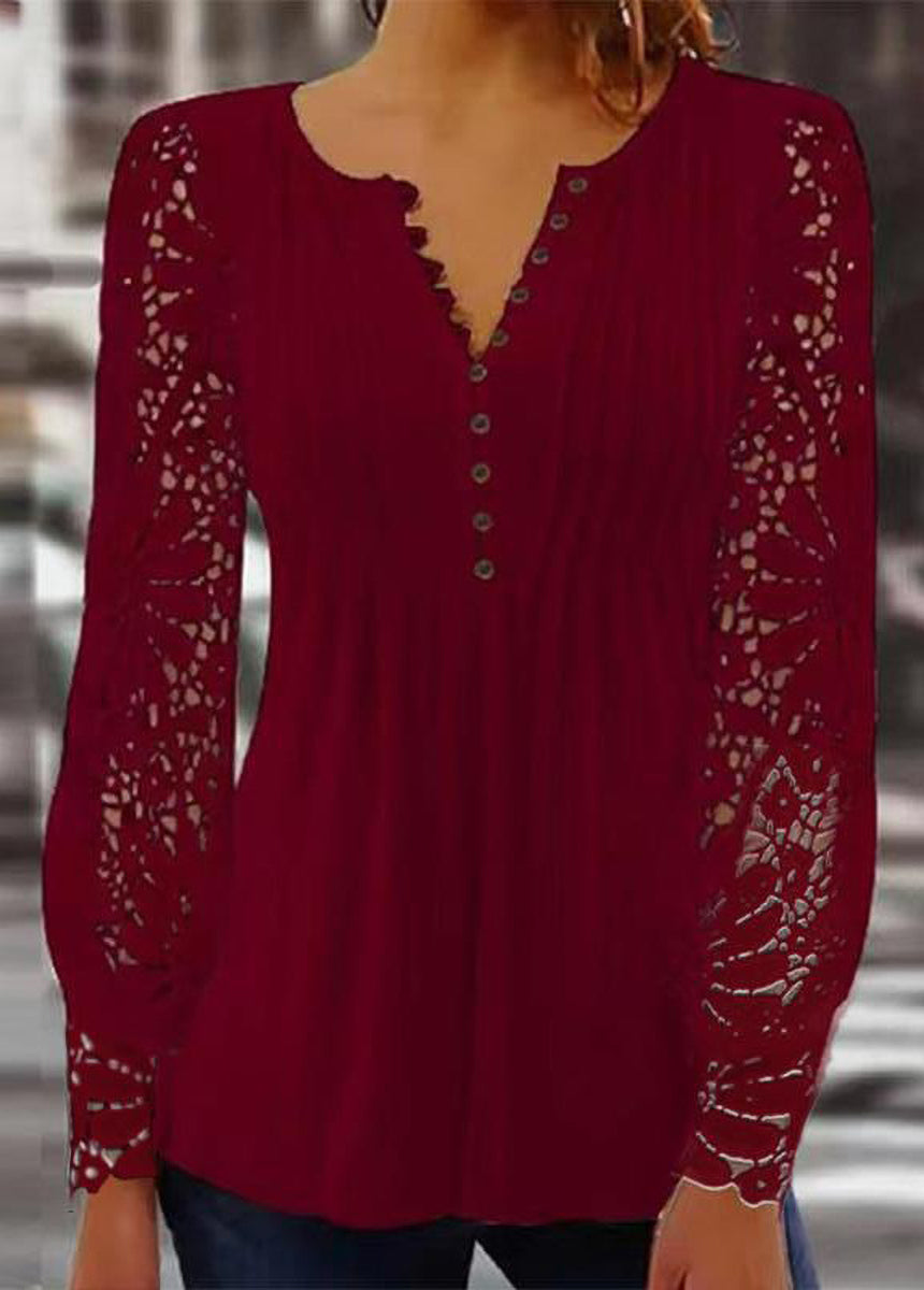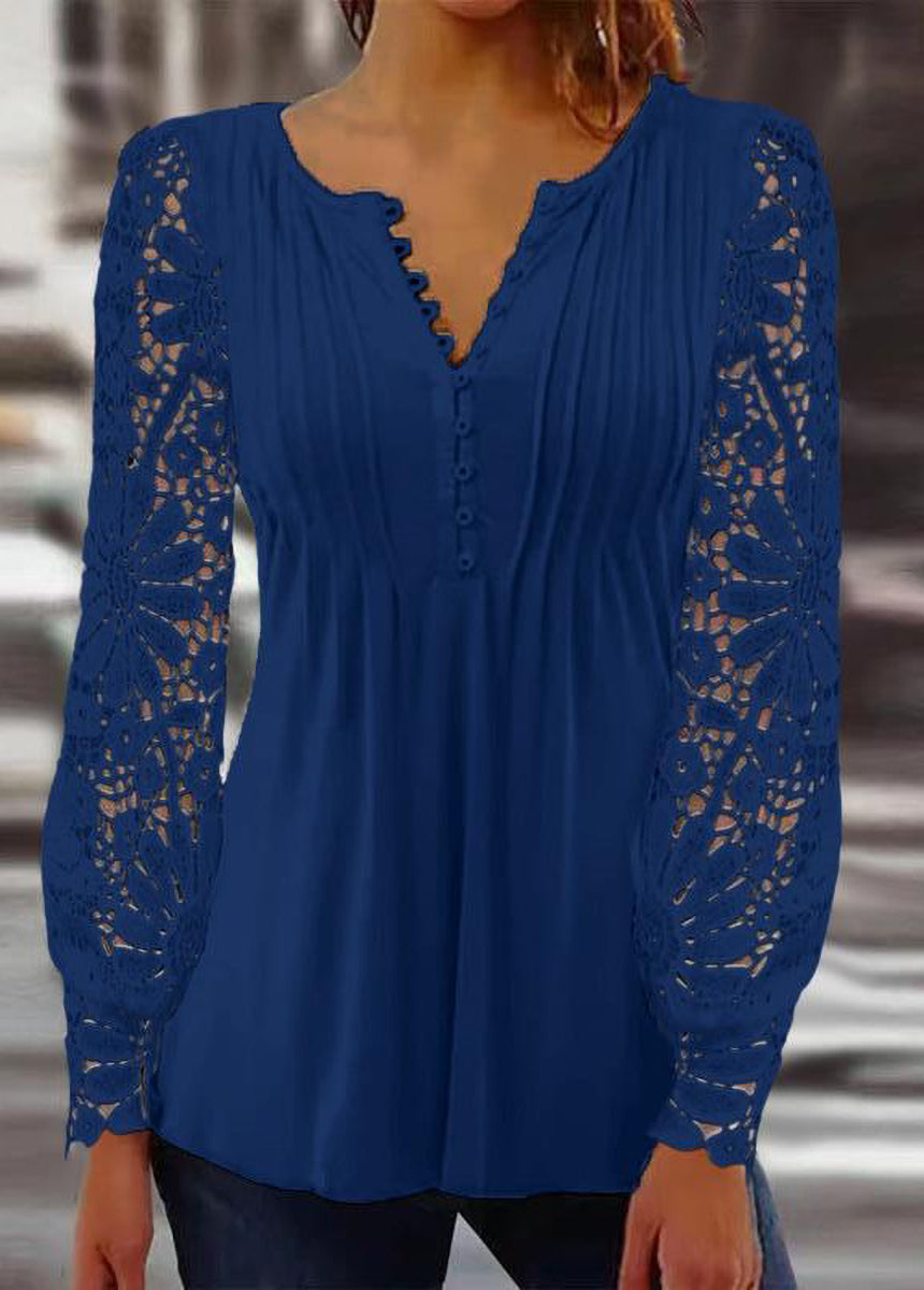 Sale Lace Trim Pleated Solid Color Long Sleeve Button-Up T-Shirt