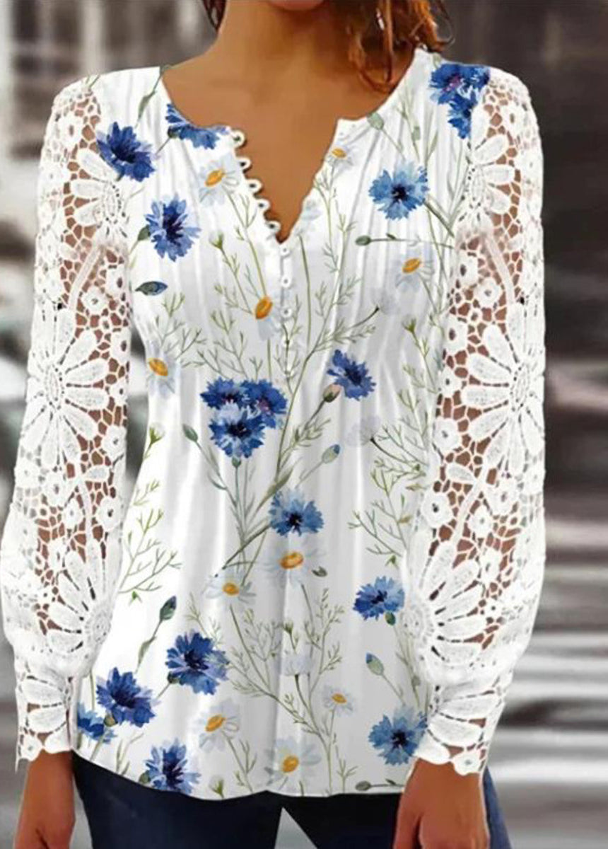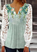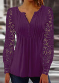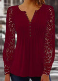 Lace Trim Pleated Solid Color Long Sleeve Button-Up T-Shirt