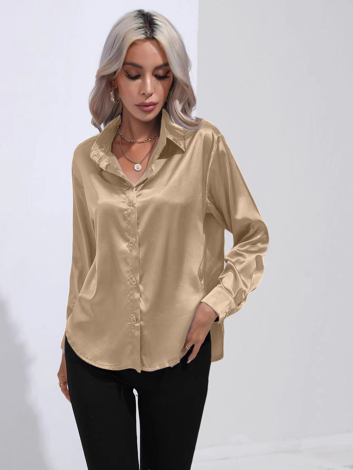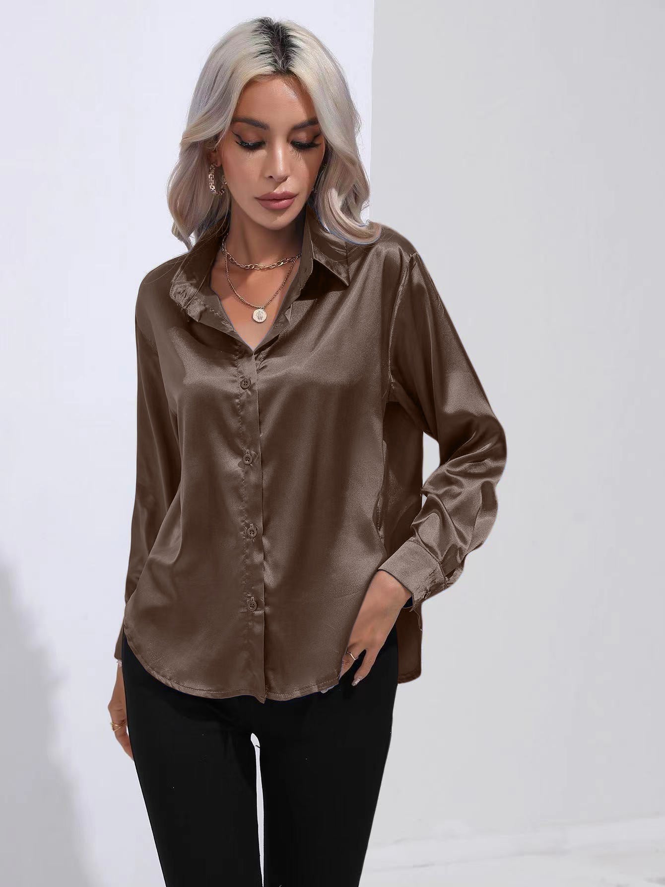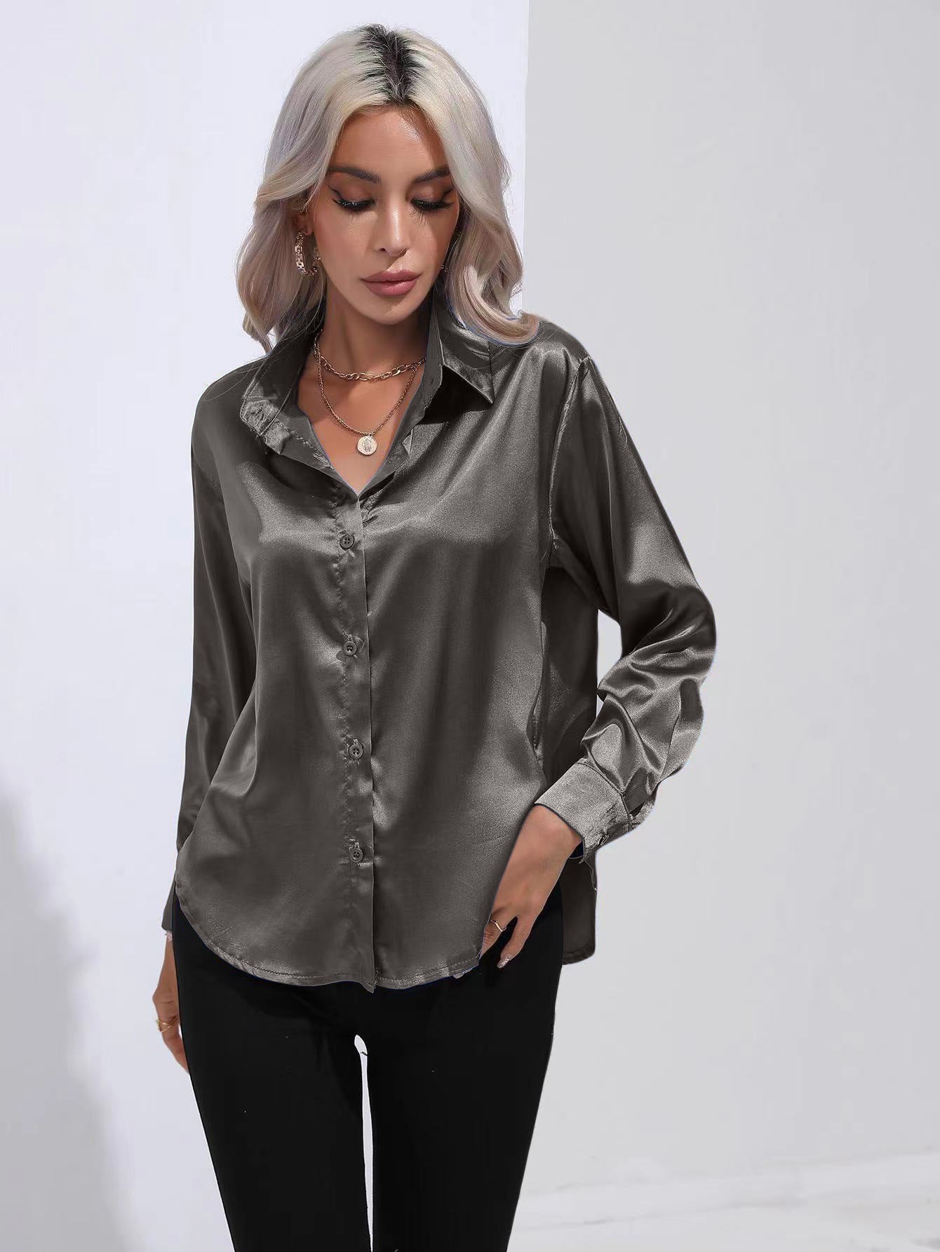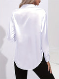 Lapel-collar Satin-satin-faux Silk Long-sleeved Shirt