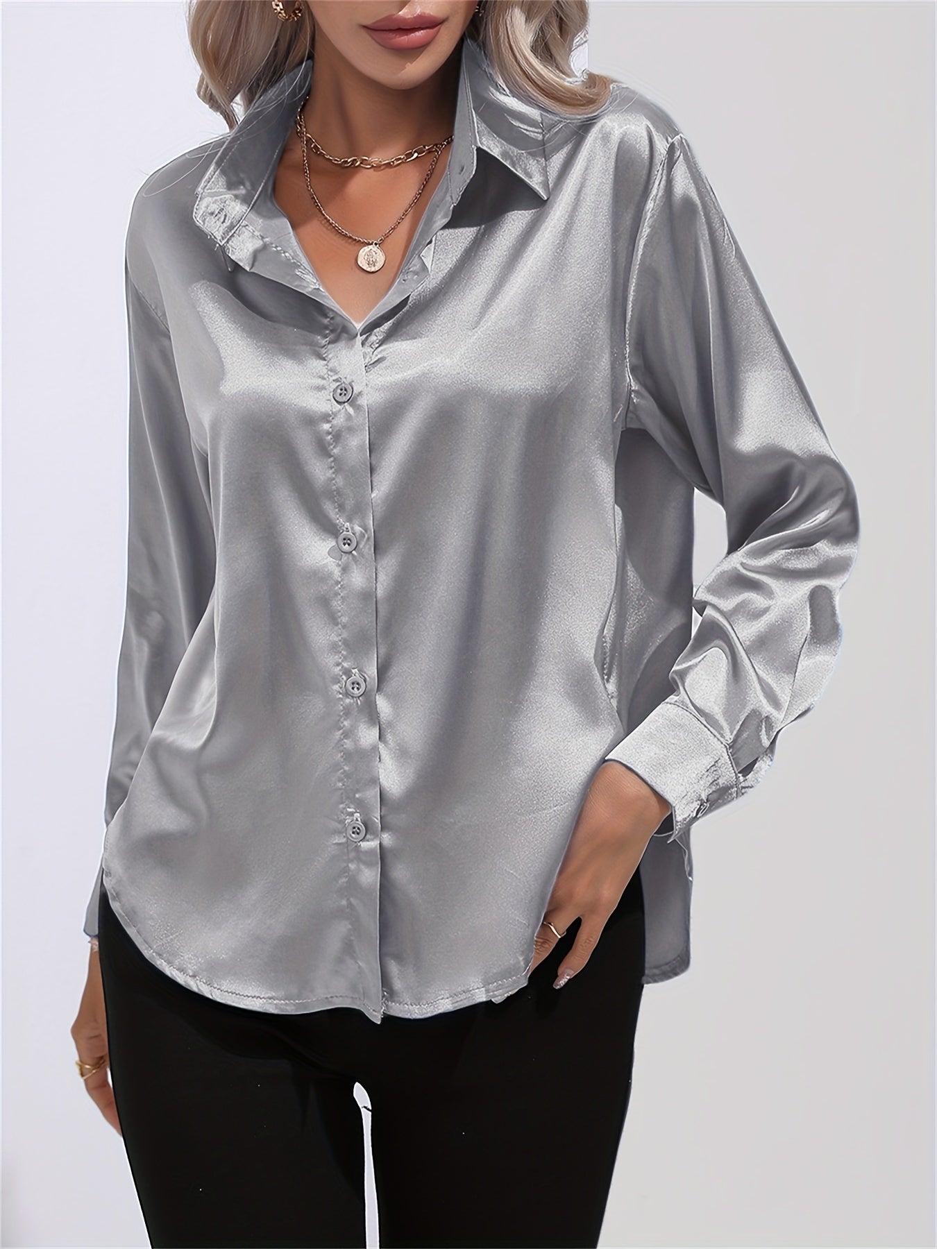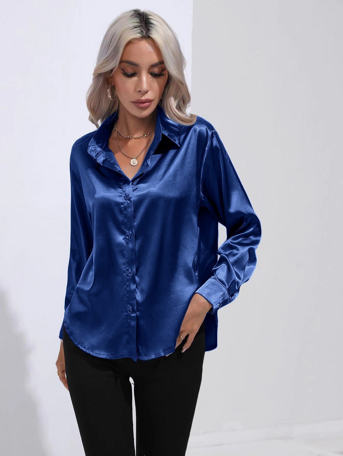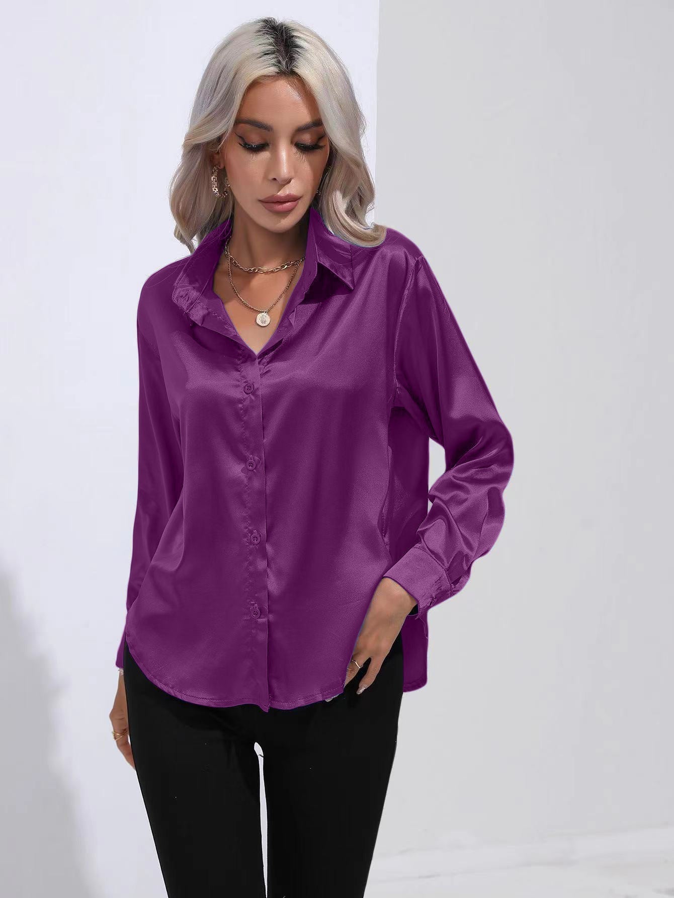 Lapel-collar Satin-satin-faux Silk Long-sleeved Shirt