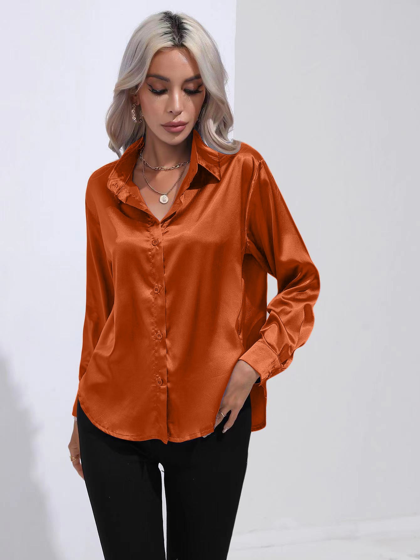 Sale Lapel-collar Satin-satin-faux Silk Long-sleeved Shirt