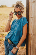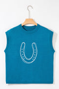 - The horse shoe embroidered design gives this short sleeve knitted top a western fashion.