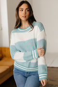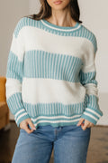 Light Blue Two Tone Striped Patchwork Drop Shoulder Loose Sweater