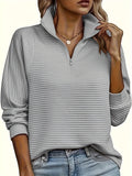 Long Sleeve Solid Color Funnel Neck Zipper Textured Sweatshirt - Soft Non-Stretch Polyester Fabric, Regular Fit, Half Placket, Casual Style