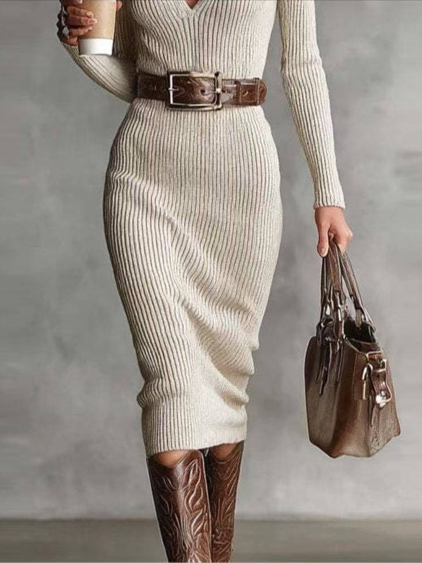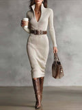 Solid Color Elegant Long Sleeve V-Neck Midi Dress