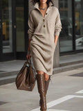 Plain Spring/Fall V Neck Long Sleeve A-Line Midi Dress