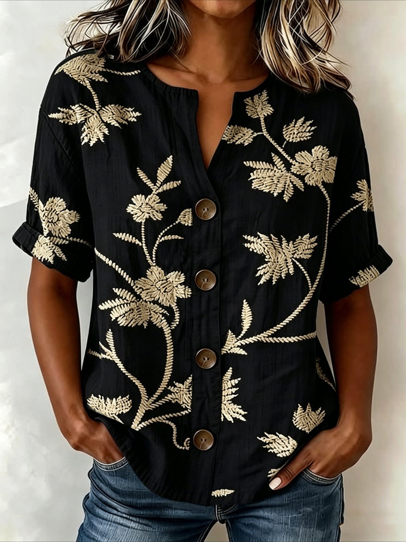 Floral V Neck Button Short Ruffle Sleeve Casual Top