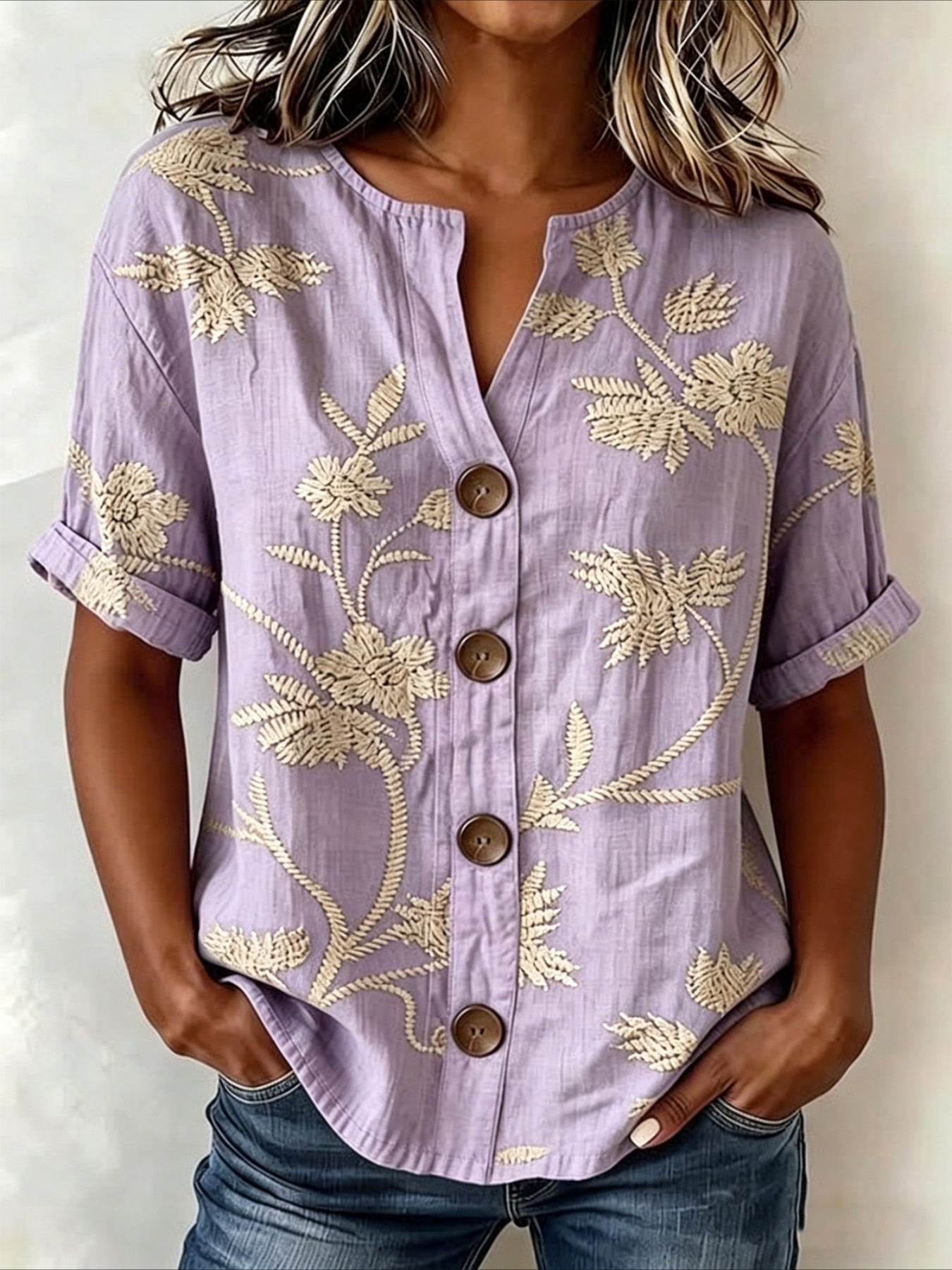Crew Neck Short Sleeve Embroidery Patterns Regular Loose Shirt