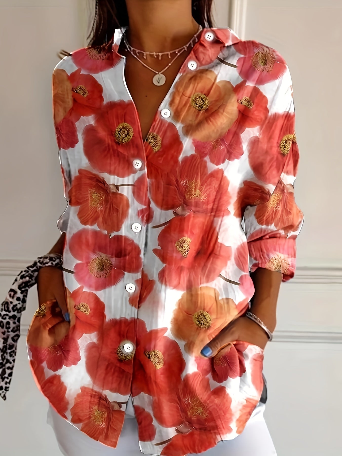 Middle Eastern-Inspired Floral Print Red Poppy Pattern on White Button-Front Placket Blouse