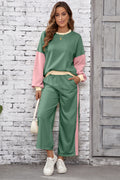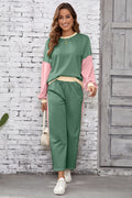 Mist Green 2pcs Color Block Pullover Loose Pant Set