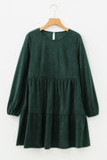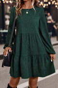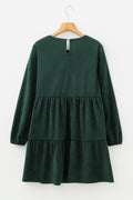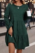 - This casual short dress is so cute and, better yet, functional.The swinging A-line tiered silhouette is perfect for any body shape.This long sleeve dress has a round neck and a button keyhole back.Style this dress with heels, boots, or sneakers for any occasion.