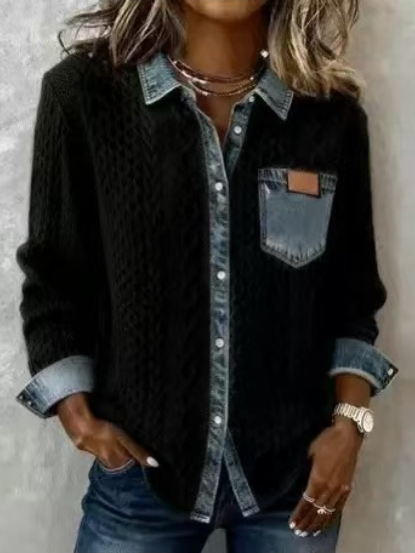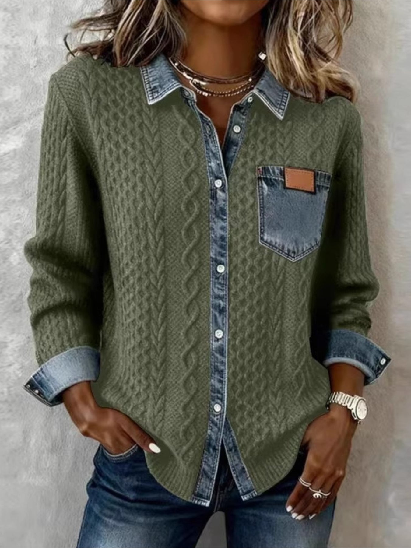 Multicolor Block Denim Patchwork Elegant Loose Shawl Collar Cardigan