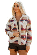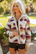 Fiery Red Western Aztec Buttoned Zipper Pockets Fleece Jacket