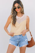 Sale Oatmeal Solid Mesh Patchwork Crew Neck Tank Top