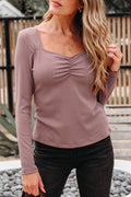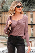 Sale Old Rose Gathered Bust Square Neck Ribbed Fit Long Sleeve Top