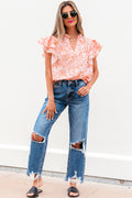 Orange Floral Ruffle Sleeve Split Neck Blouse