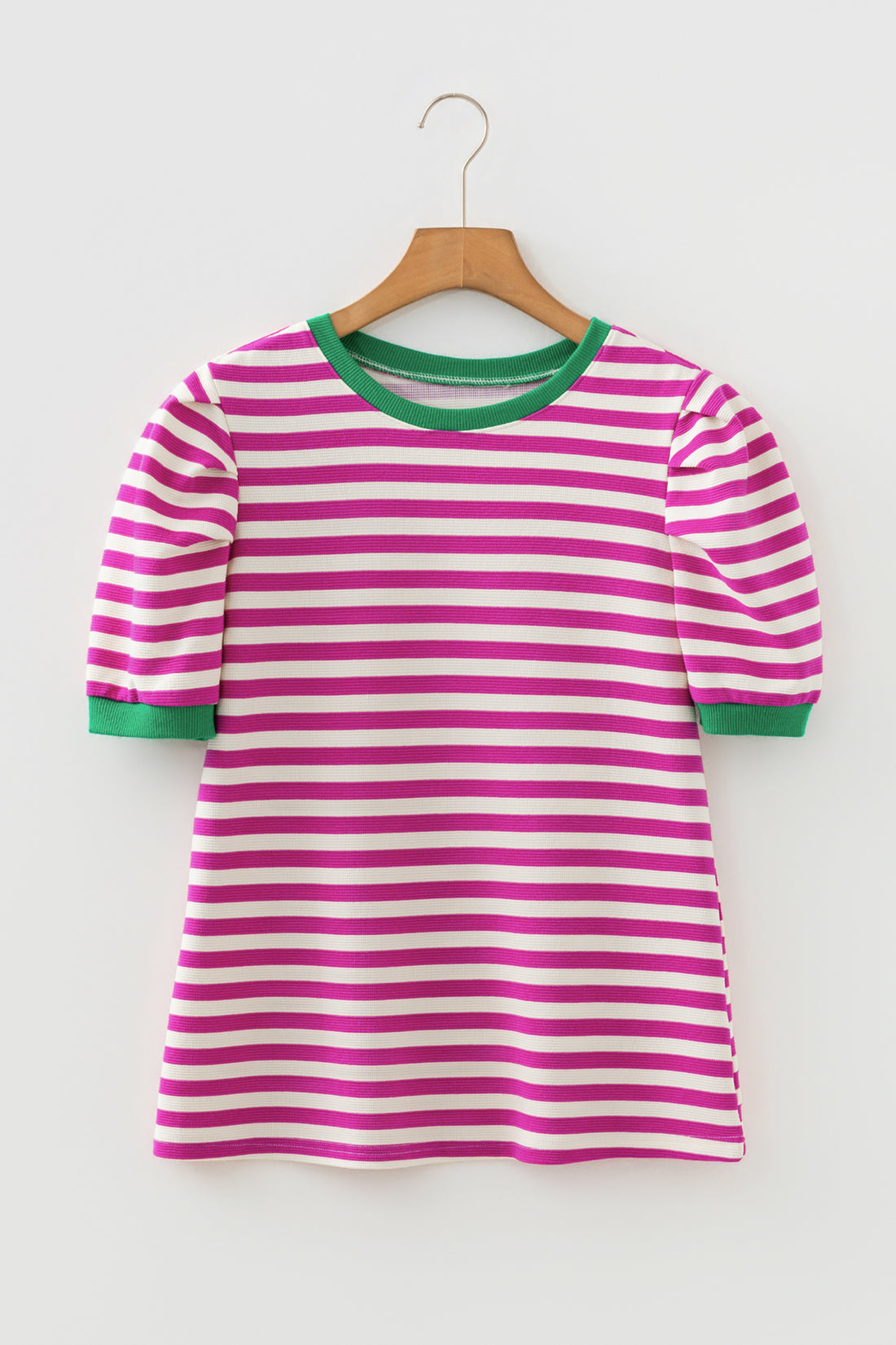 Rose Stripe Short Puff Sleeve Contrast Trim Round Neck Tee