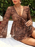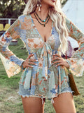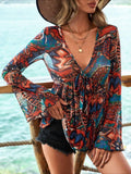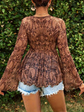 Paisley Print Tucked Tie Front Blouse with Bell Sleeves, Plunging Neckline, Vacation Style Blouse