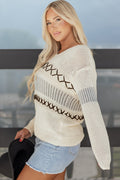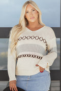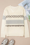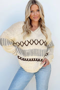 - Contrast stitch detail adds a trendy, eye-catching accent.Flattering V neck highlights your neckline elegantly.Drop shoulder design creates a relaxed, laid-back vibe.Soft knit fabric keeps you cozy in cold weather.