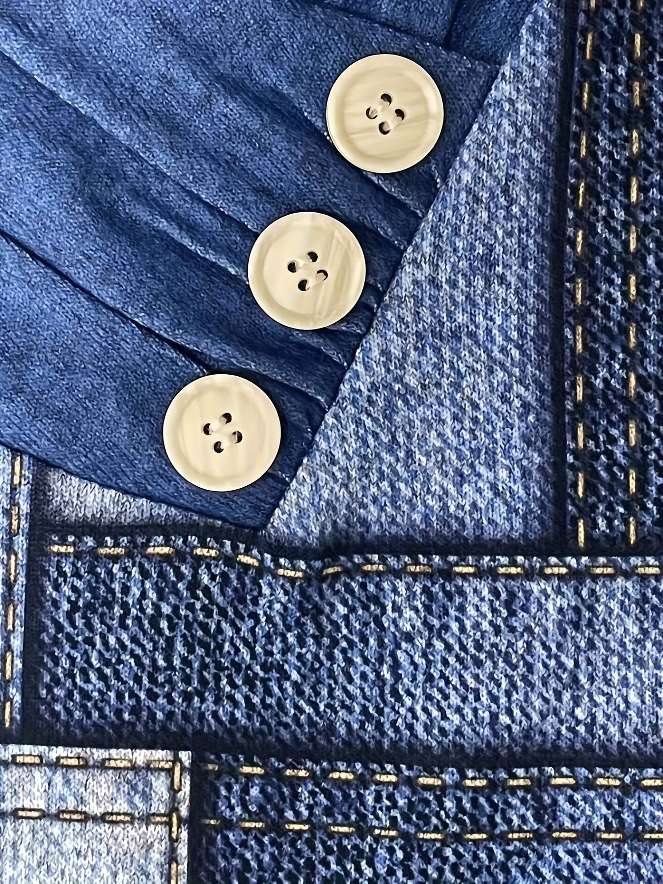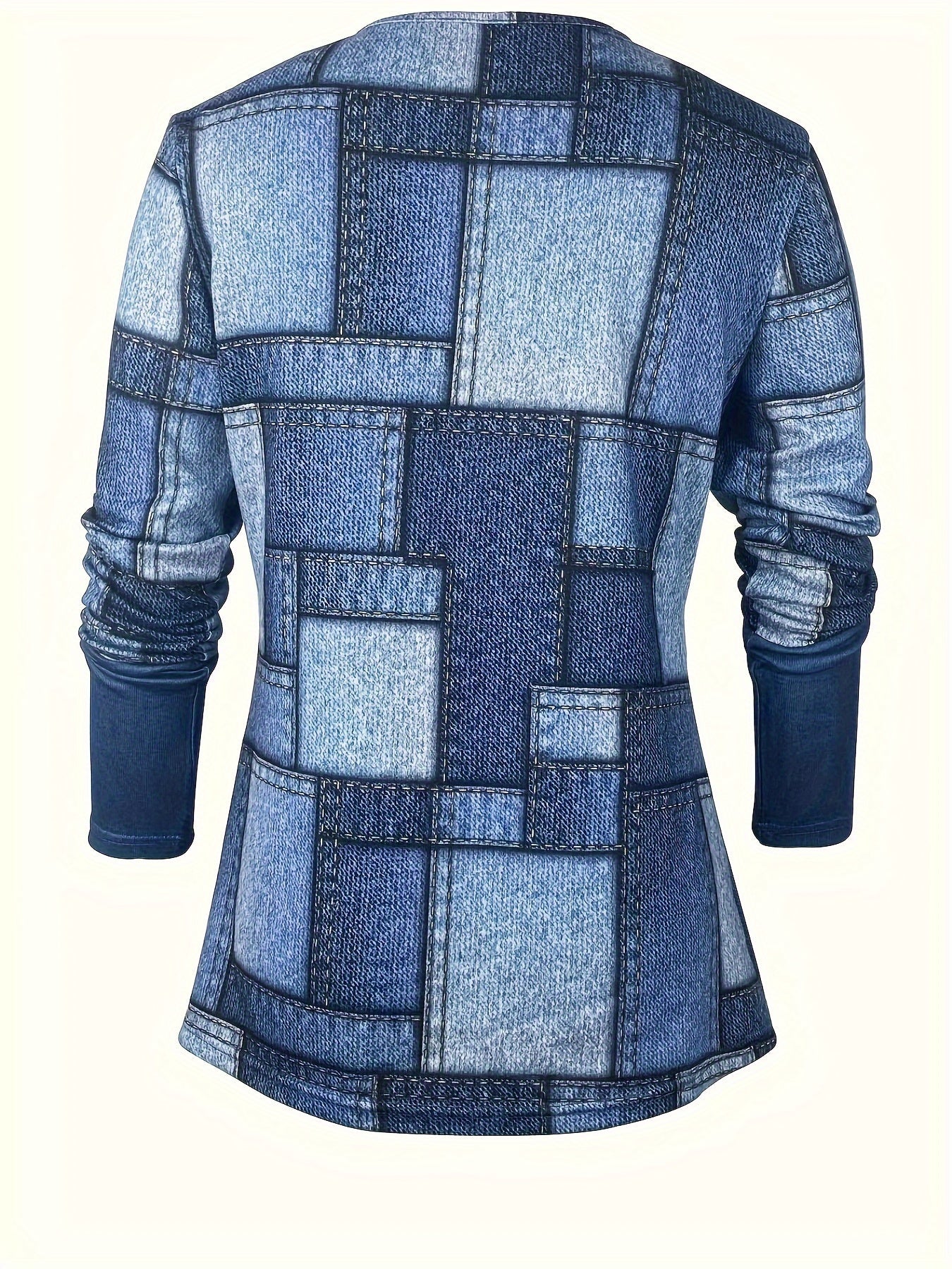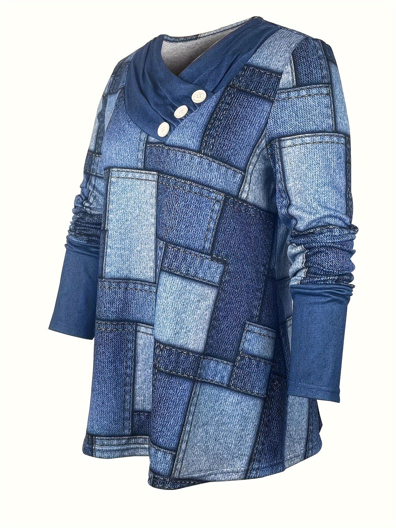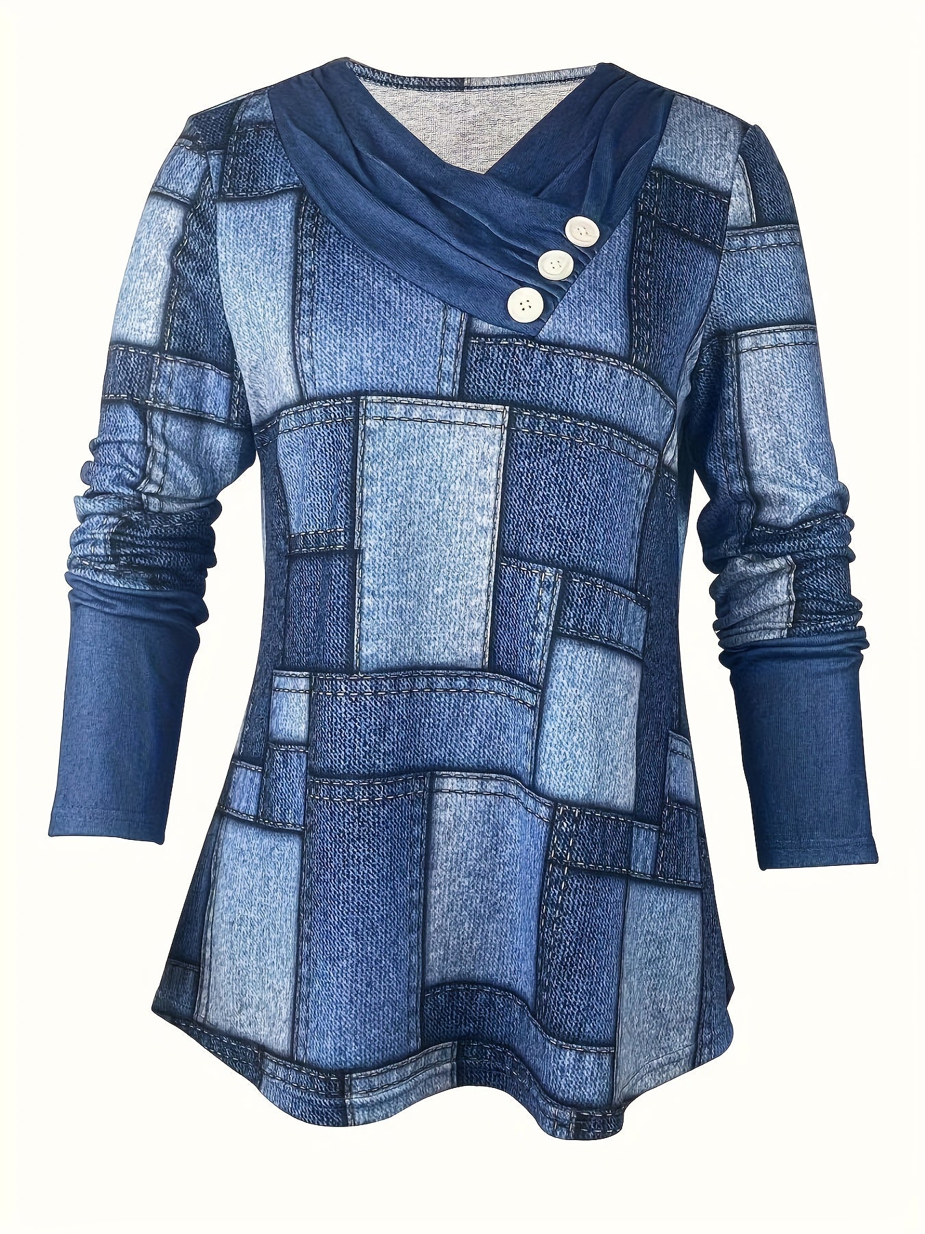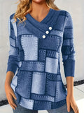 Patchwork Print Button Decor Tunics, Casual Long Sleeve V-neck
