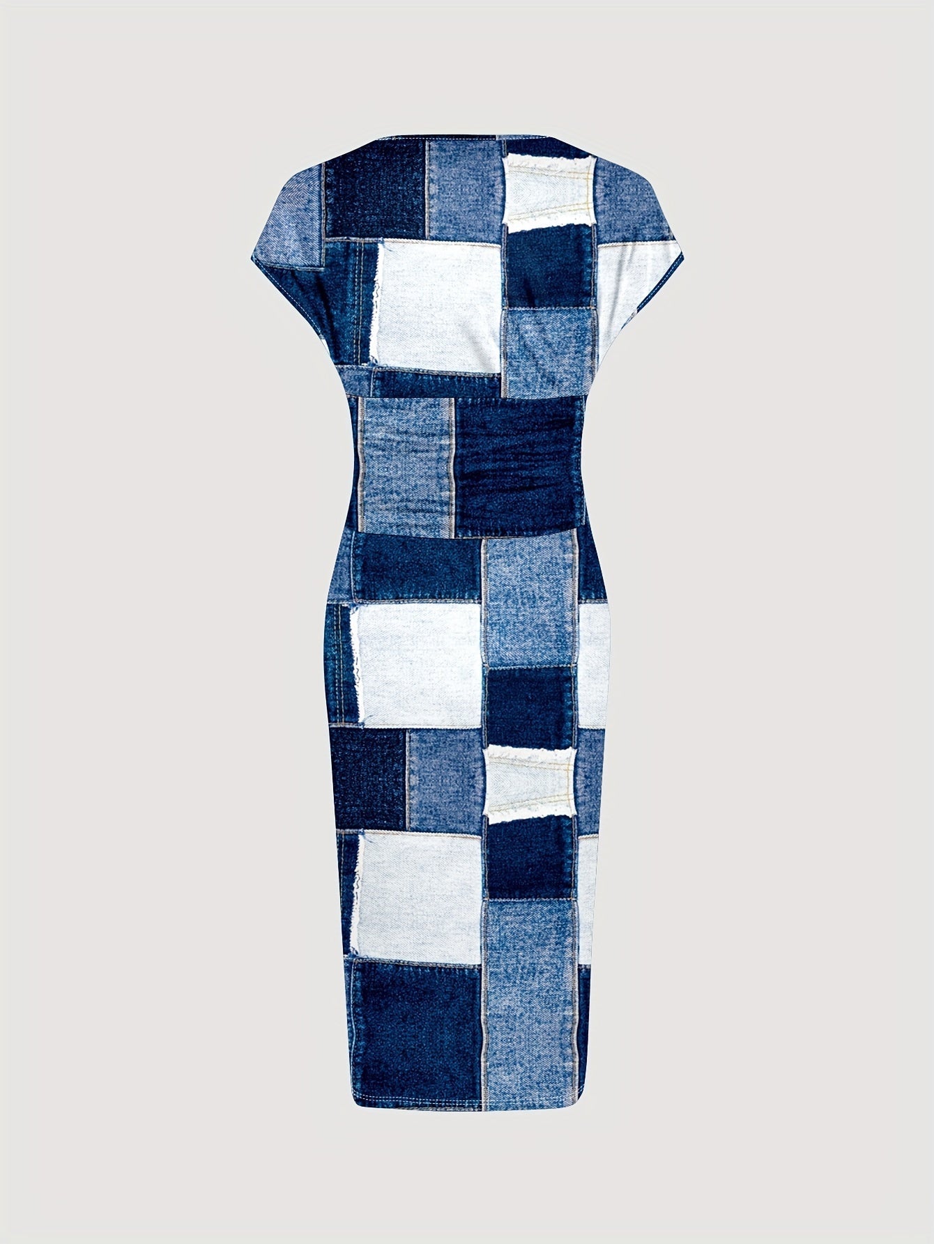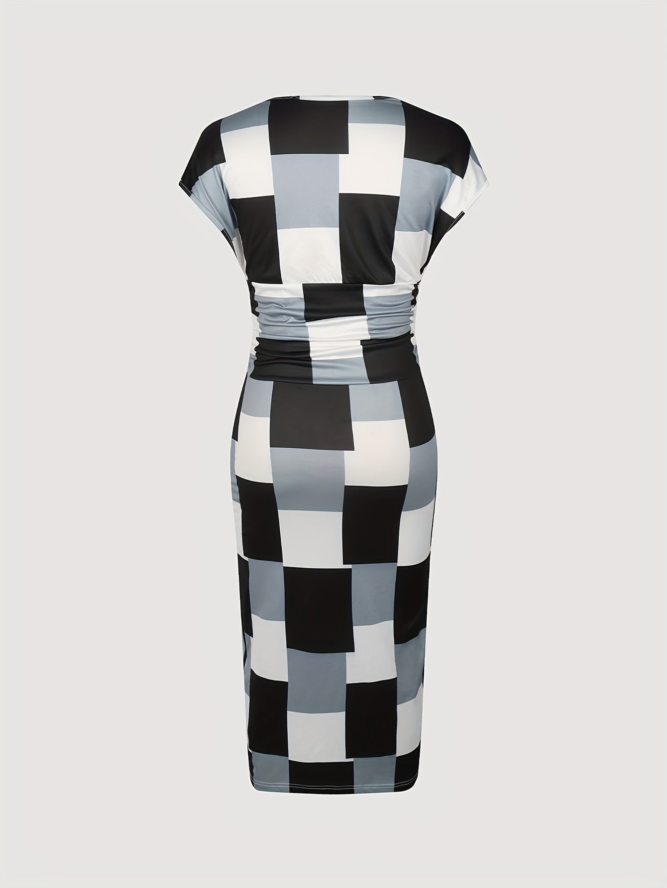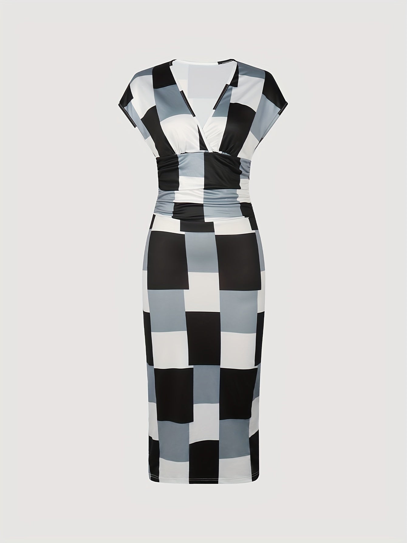 Patchwork Print V Neck Dress, Elegant Short Sleeve Dress