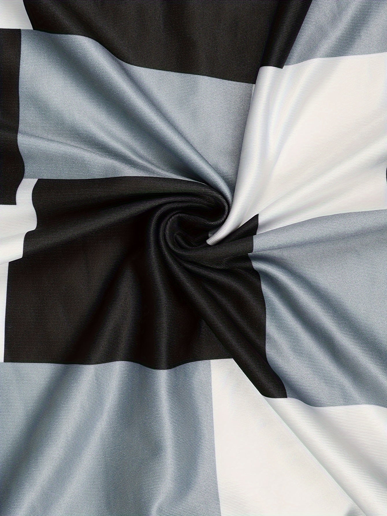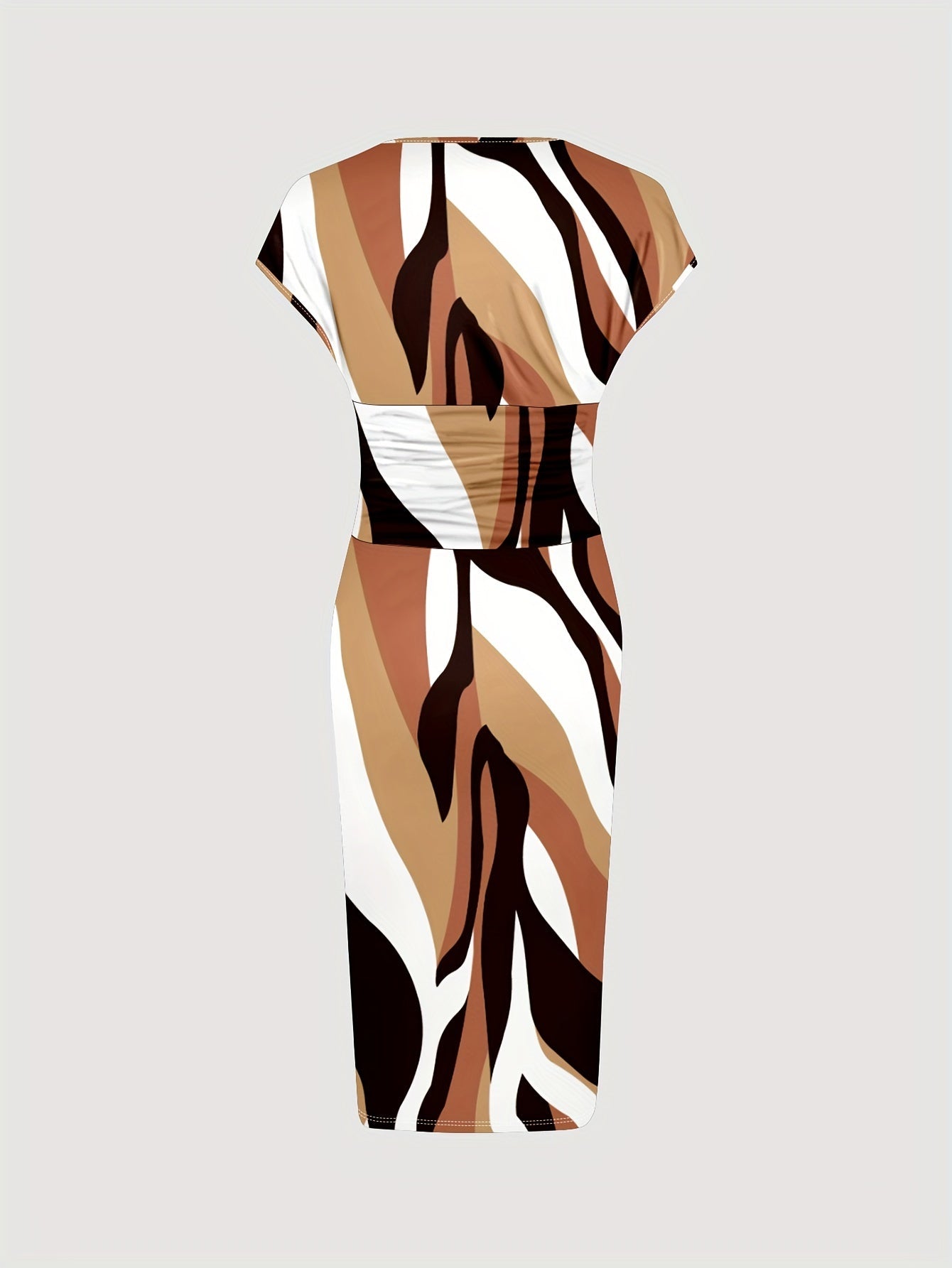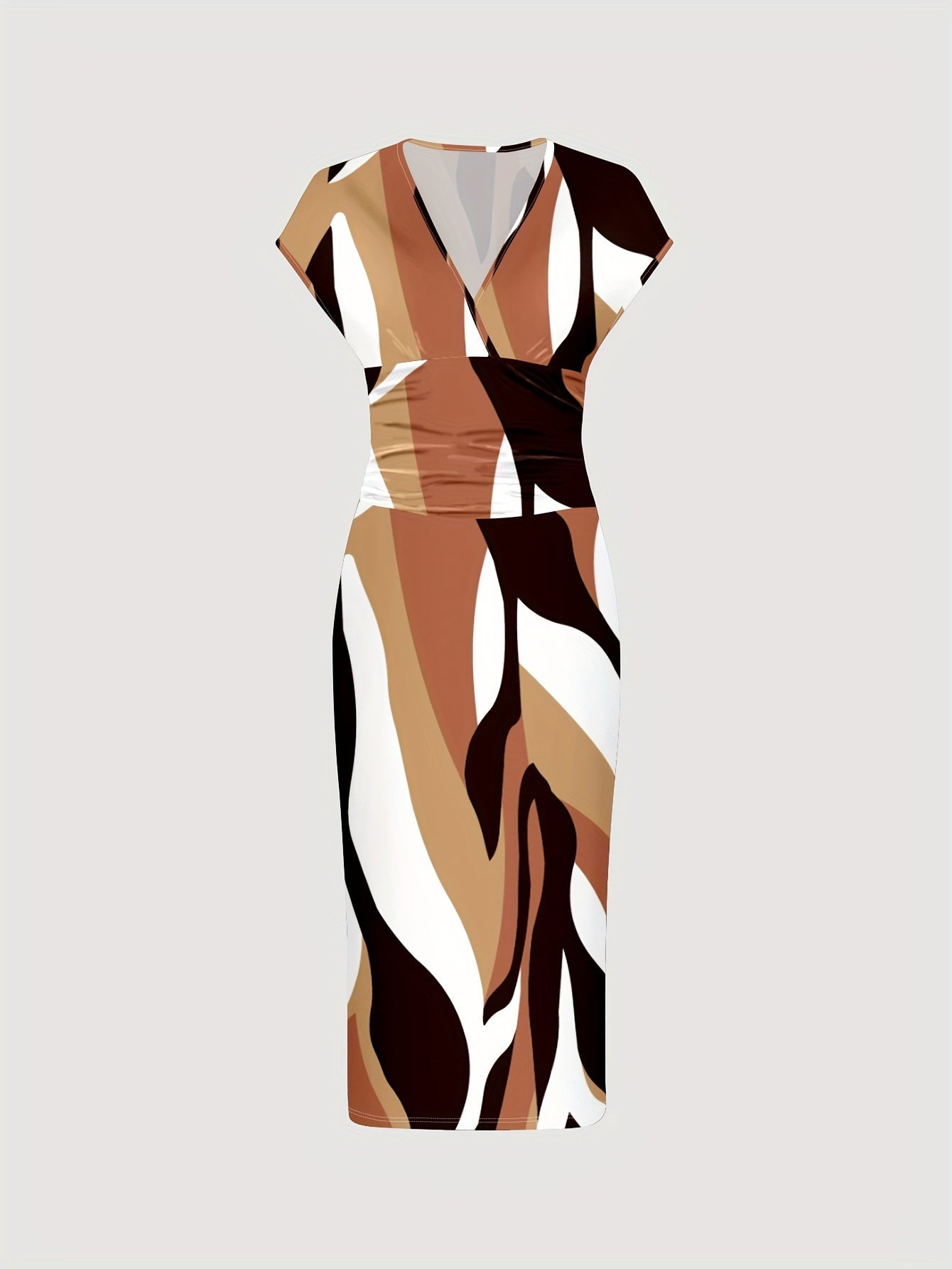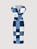 Patchwork Print V Neck Dress, Elegant Short Sleeve Dress
