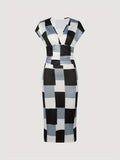 Sale Patchwork Print V Neck Dress, Elegant Short Sleeve Dress