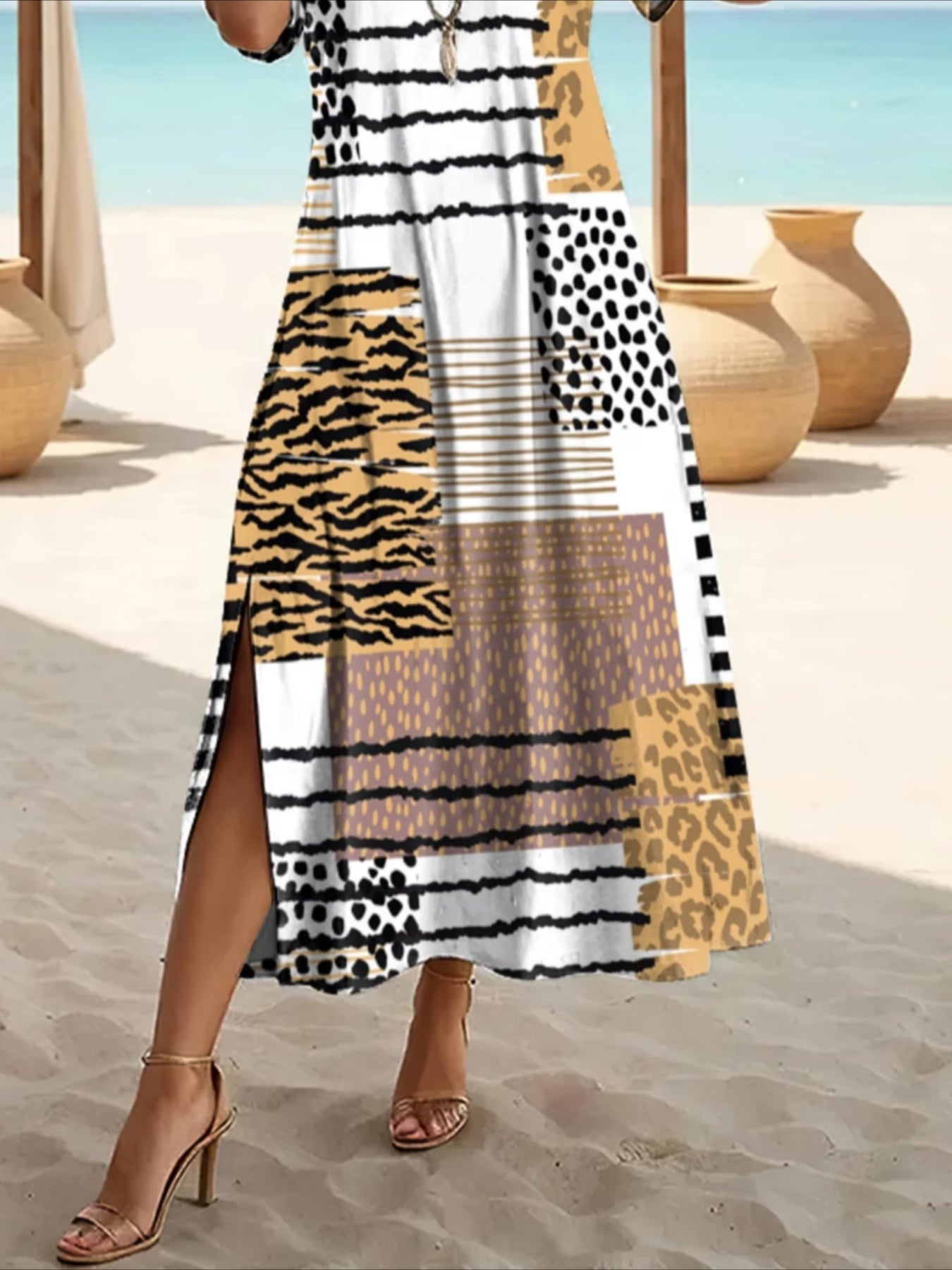 Leaf Summer V Neck Short Sleeve Beach A-Line Dress