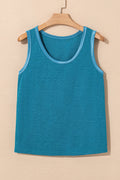 Sale Blue Sapphire Solid Color Stitching Detail Round Neck Tank Top