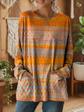 Colorful Ribbed V Neck Braided Print Long Sleeve Regular Sweatshirt