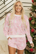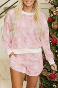 Pink Christmas Tree Nutcracker Doll Print Contrast Trim Long Sleeve Top Matching Shorts Set