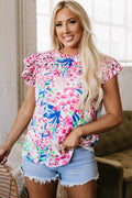 Pink Floral Mixed Print Ruffle Cap Sleeve Blouse