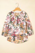 Pink Floral Print Lace Embroidery Tie Split Neck Long Sleeve Blouse