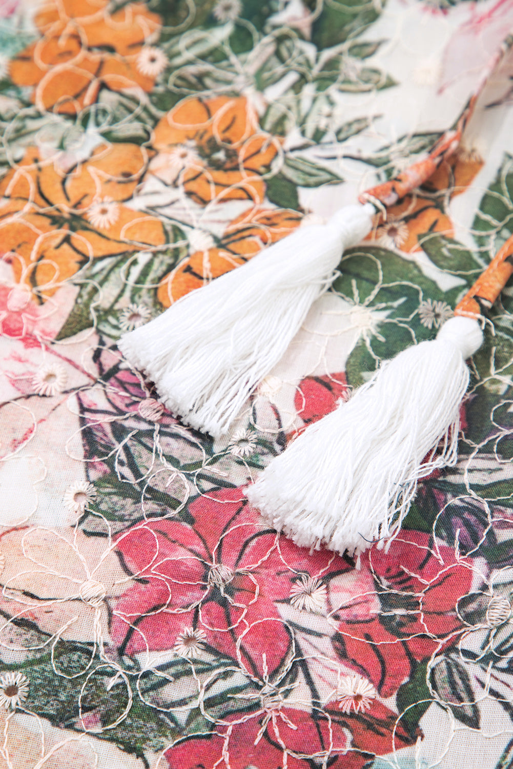 - Floral print blouse with delicate lace embroidery details.It has a split neck with ties, full length sleeves with elastic cuff.Made of soft lightweight fabric, very comfortable to wear.Perfect for dressy casual or workwear, simply with jeans or a skirt.