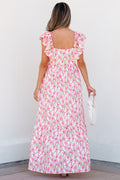 Sale Pink Floral Print Square Neck Ruffled Strap Maxi Dress
