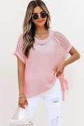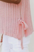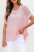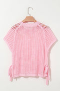 Pink Hollow-out Crochet Side Tied Short Sleeve Sweater