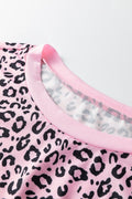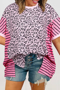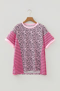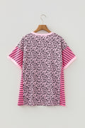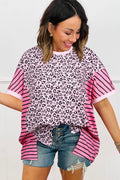 Pink Leopard Striped Patchwork Side Slit Loose Short Sleeve Top