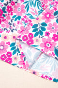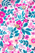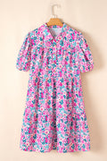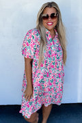 Sale Pink Plus Size Floral Half Button Short Puff Sleeve A-line Dress