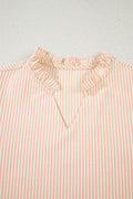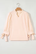 Sale Pink Stripe Bow Knot Cuff Pearl Embellished Puff Sleeve V Neck Blouse