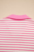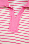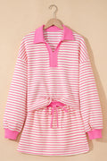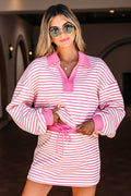 Pink Stripe Collared V Neck Drop Shoulder Pullover and Skort 2pcs Outfit